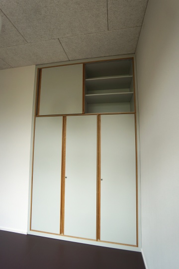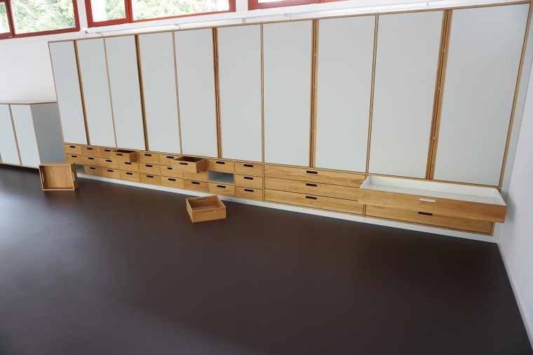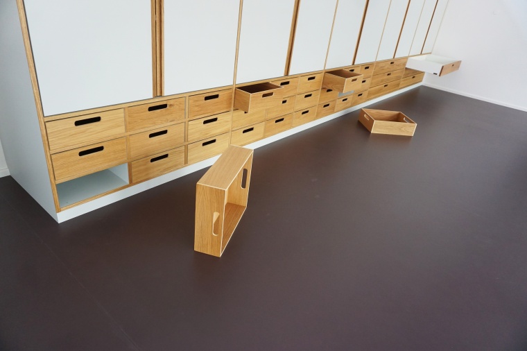 Die Schrankfronten sind aus Kunstharz belegten Platten mit einer Antifingerprint Oberfläche. Als Griff dient eine Türhohe Griffleiste aus massiver Eiche. Die Sichtkanten der Möbelseiten sind ebenfalls aus massiven Eichenanleimern. Die kleinen Schubladen sind aus extra leichtem Sperrholz welche mit Eiche furniert sind. Alle Massivholzelemente sind mit Naturöl behandelt.