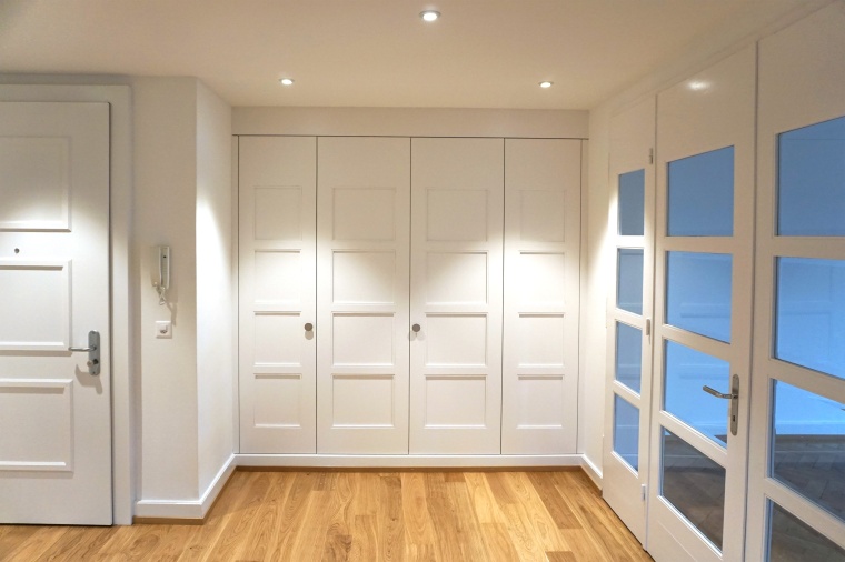 Die Fronten dieses schönen Einbauschranks sind den bestehenden Türen mit Glasfüllungen nachempfunden. Mit der einheitlichen Optik der einzelnen Elemente ergibt sich ein harmonisches Bild in der Wohnung.