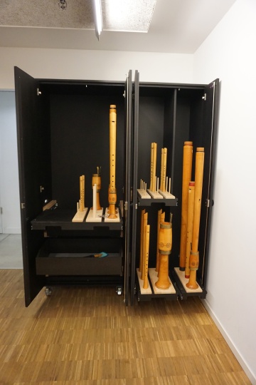 Als erstes haben wir die Masse aufgenommen, vom Platz wo die Schränke zu stehen kommen sollen. In einem weiteren Schritt haben wir alle Flöten ausgemessen mit Höhe und Durchmesser und aufgezeichnet in welcher Anordnung sie dann im Schrank platziert werden.