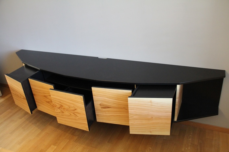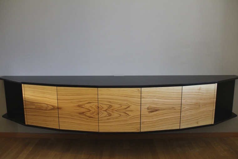 Das Alexboard ist ein freischwebendes Sideboard, das durch seine starke Kontrastgebung besticht. Die Fronten der Schubladen sind von Hand mit Olivenholz furniert, dabei wurde darauf geachtet dass die einzelnen Teile ein fortlaufendes Bild ergeben. Das Innenleben sowie Boden und Deckel sind aus schwarzem MDF gefertigt. Die Oberfläche wurde mit einem hochwertigen Lack versiegelt. Die Schubladen werden mittels antippen geöffnet, dadurch kommt man ohne Griffe klar.