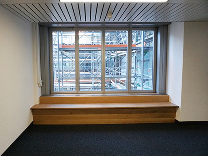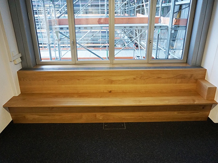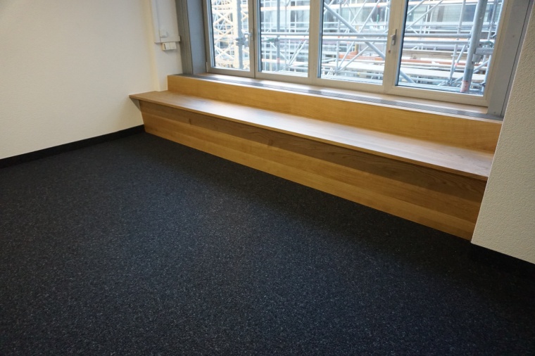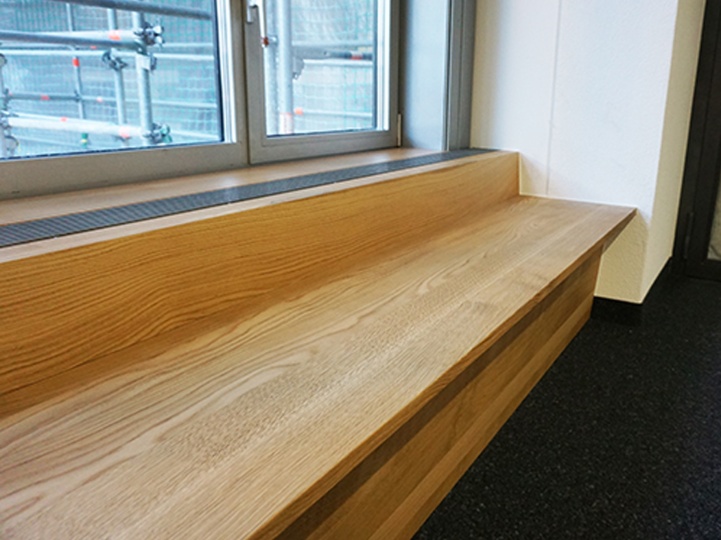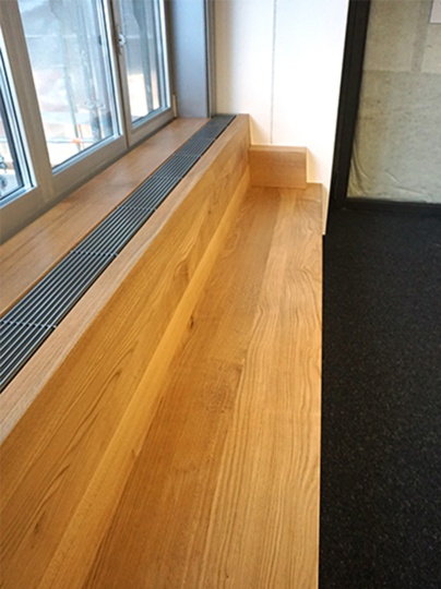 In einem öffentlichen Gebäude durfen wir diese Bänke aus massivem Eichenholz montieren. Ursprünglich war an dieser Stelle ein einfacher Sims mit Blechabdeckung um die Heizkörper zu verdecken. Wir haben einen Teil der bestehenden Metallkonstruktion entfernt und mit einer neuen Metallkonstruktion von uns ergänzt. Auf die neue Metallkonstruktion konnten wir dann unseren neuen Sitzbank befestigen.