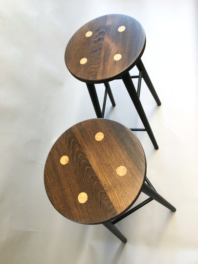 Martin Reich, einer unserer Mitarbeiter hat für sich Zuhause diese wunderschönen Barstühle ("Button Chairs") angefertigt. Die Beine sind aus Eiche, schwarz gespritzt. Die Sitzfläche aus Räuchereiche, geölt. Durch die durchgehende Verbindung, entstehen die hellen Kreise die auf der Sitzfläche zu sehen sind.