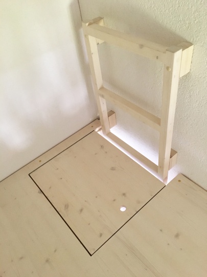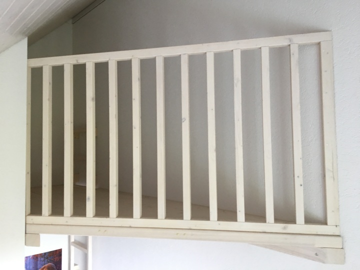 Um den Raum im Kinderzimmer zu erweitern, haben wir im Eingangsbereich einen Zwischenboden angefertigt und montiert. Auf den Zwischenboden gelangt man über eine Leiter die ebenfalls Fix an die Wand montiert ist. Die ganze Konstruktion ist aus Fichtenholz und wurde aufhellend lackiert.