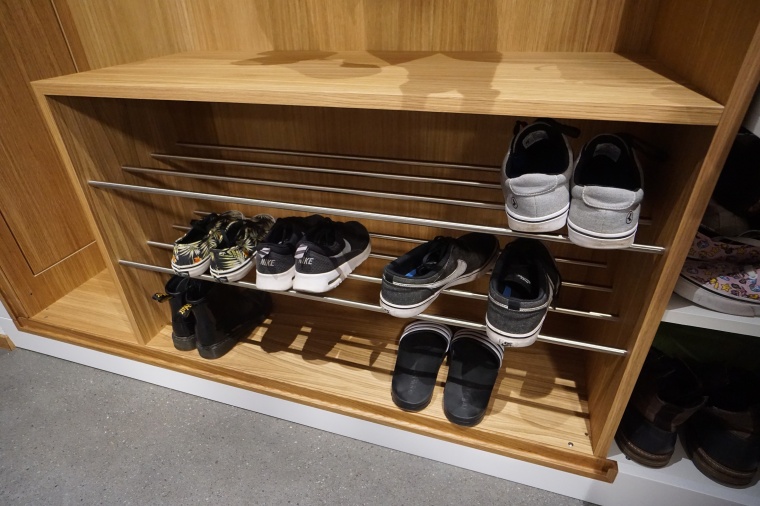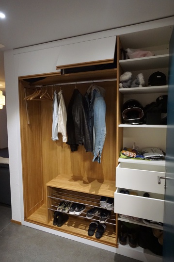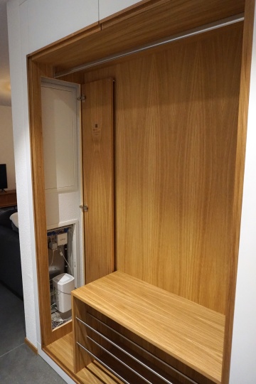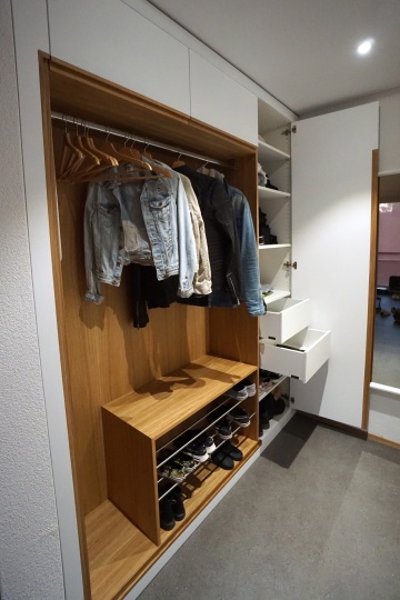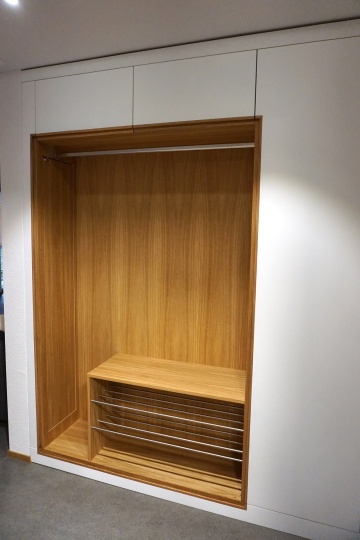 Schlichte Einbau-Garderobe, eine Kombination aus Eiche, Chromstahl und weiss lackierten Fronten. Der offene Bereich mit Kleiderstange und Schuhgestell hat auf der linken Seite eine Seviceklappe, um an den dahinterliegenden Sicherungskasten zu kommen. Die Tür auf der rechten Seite, sowie die beiden Klappen oben, haben eine Griffleiste aus massivem Eichenholz. Um die gleiche Optik zu bekommen, hat der Sockel und der Beistoss ebenfalls ein Griffprofil aus Eiche, damit sich eine Art Rahmen um den offenen Bereich bildet. Im Schrank auf der rechten Seite gibt es neben den Tablaren noch zwei Innenschubladen.