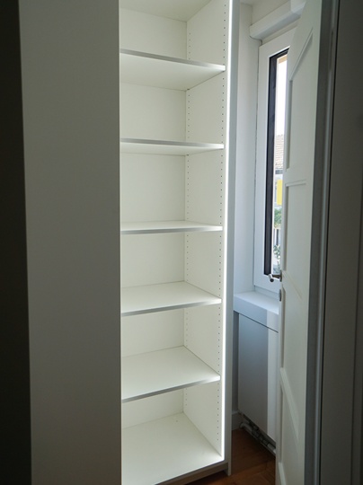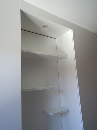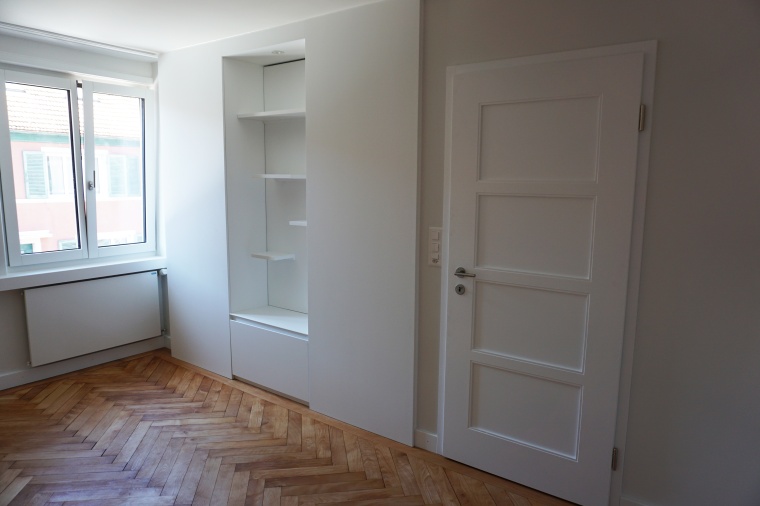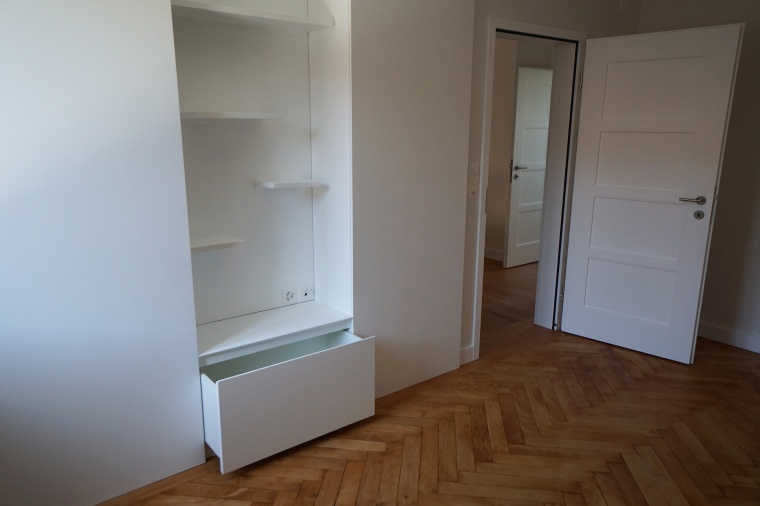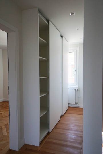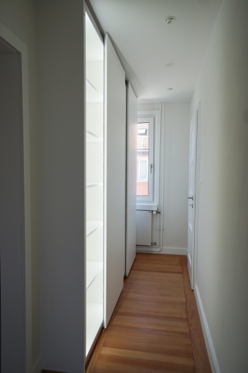 Dieser Schrank wurde als Raumtrenner/Wanderweiterung eingebaut. Das spezielle daran ist das der Schrank auf beide Seite eine Funktion hat. Von der Raumseite kann man das Regal mit den magnethaftenden Tablaren und eine Schublade unterhalb bedienen. Von der Gangseite ist der Schrank als Schiebetürschrank zu bedienen.