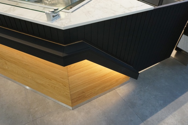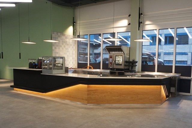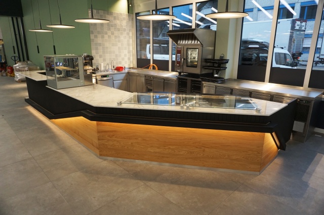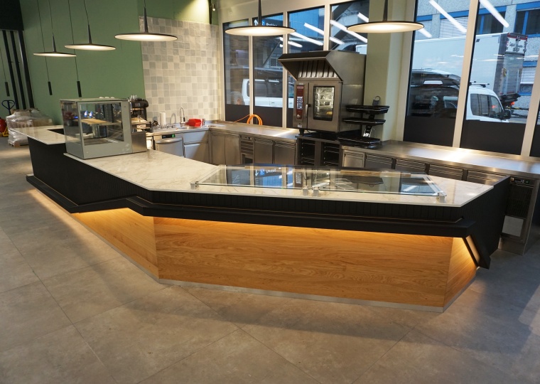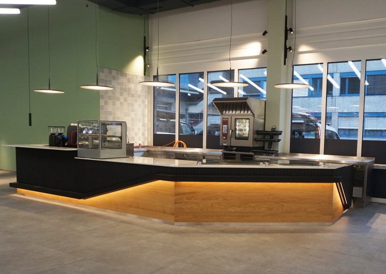 In einer Einkaufspassage in Dietikon haben wir in Zusammenarbeit mit Pahl Gastroküchen diese Imbiss Bar umgesetzt. Die ganze Holzverkleidung wurde mit einer sehr wiederstandfähigen Lackoberfläche geschützt. Rund um die Theke verläuft in einem Kanal der gleichzeitig Dekoelement und im Barbereich eine Fussablage ist, eine LED-Beleuchtung. Die Thekenablagen sind aus weissem Kunststein in Marmoroptik gefertigt.