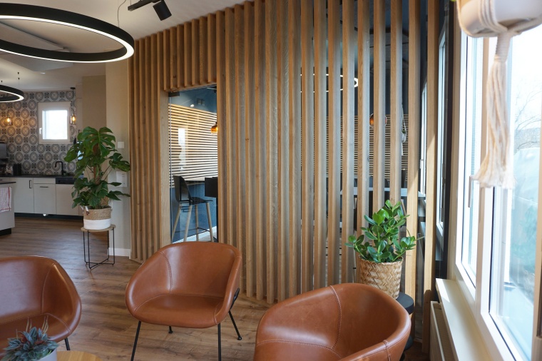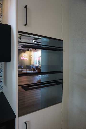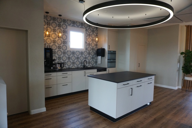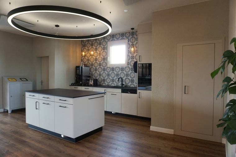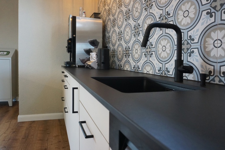 Bei einem Komplettumbau eines Personalraums haben wir die Küche und einen optischen Raumtrenner geplant und ausgeführt. Die Küche verfügt über eine Abwaschmaschine, ein Gefrierschrank, einen Kühlschrank und zwei Mikrowellen, die fest verbaut sind. Die Kundschaft wünschte sich ebenfalls 2 Mülleimer mit Kick-Funktion. Die Küchenrückwand besteht aus Keramikplatten.