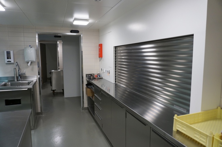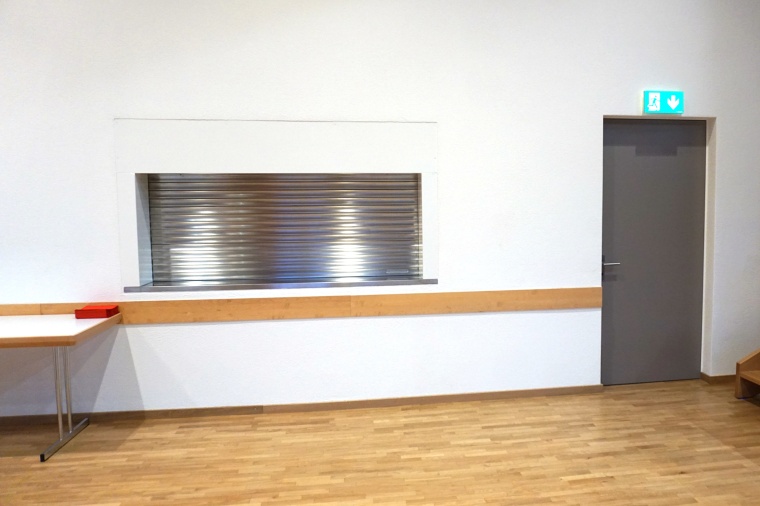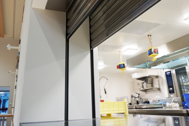 Für eine Industrieküche haben wir ein Thekentor geplant und umgesetzt, welches die heutigen Brandschutzanforderungen erfüllt. Das Thekentor lässt sich von der Küchenseite her mittels Schlüsselumdrehung öffnen und schliessen und im Brandfall schliesst sich das Tor von alleine.
